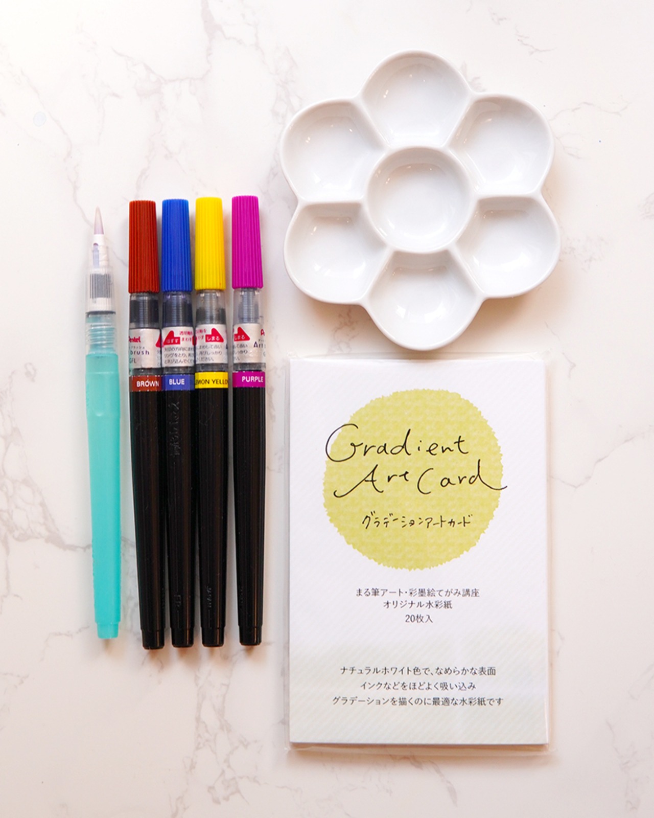 筆文字アートを描くときに必要なペン類に、梅皿(パレット)、筆文字アートに最適なハガキ用紙がセットされた、基本の組み合わせです。
